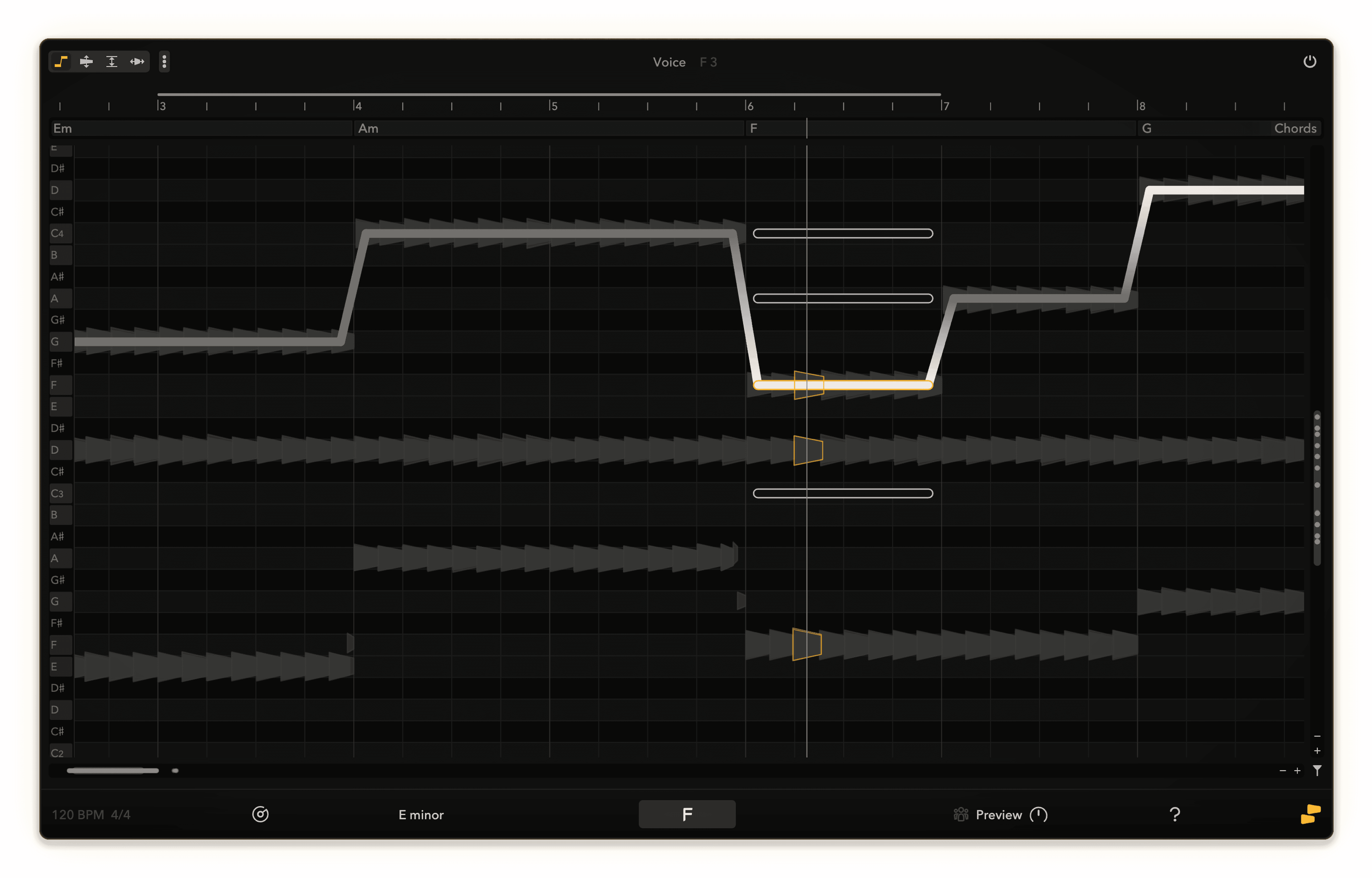 Refine lets you shape individual notes and chords while preserving the intent of the original performance. It feels like working directly with the musician. Adjust notes, amplitude, timing, or voice-leading — and Tonalic responds musically, reshaping the surrounding harmony to keep the performance natural.