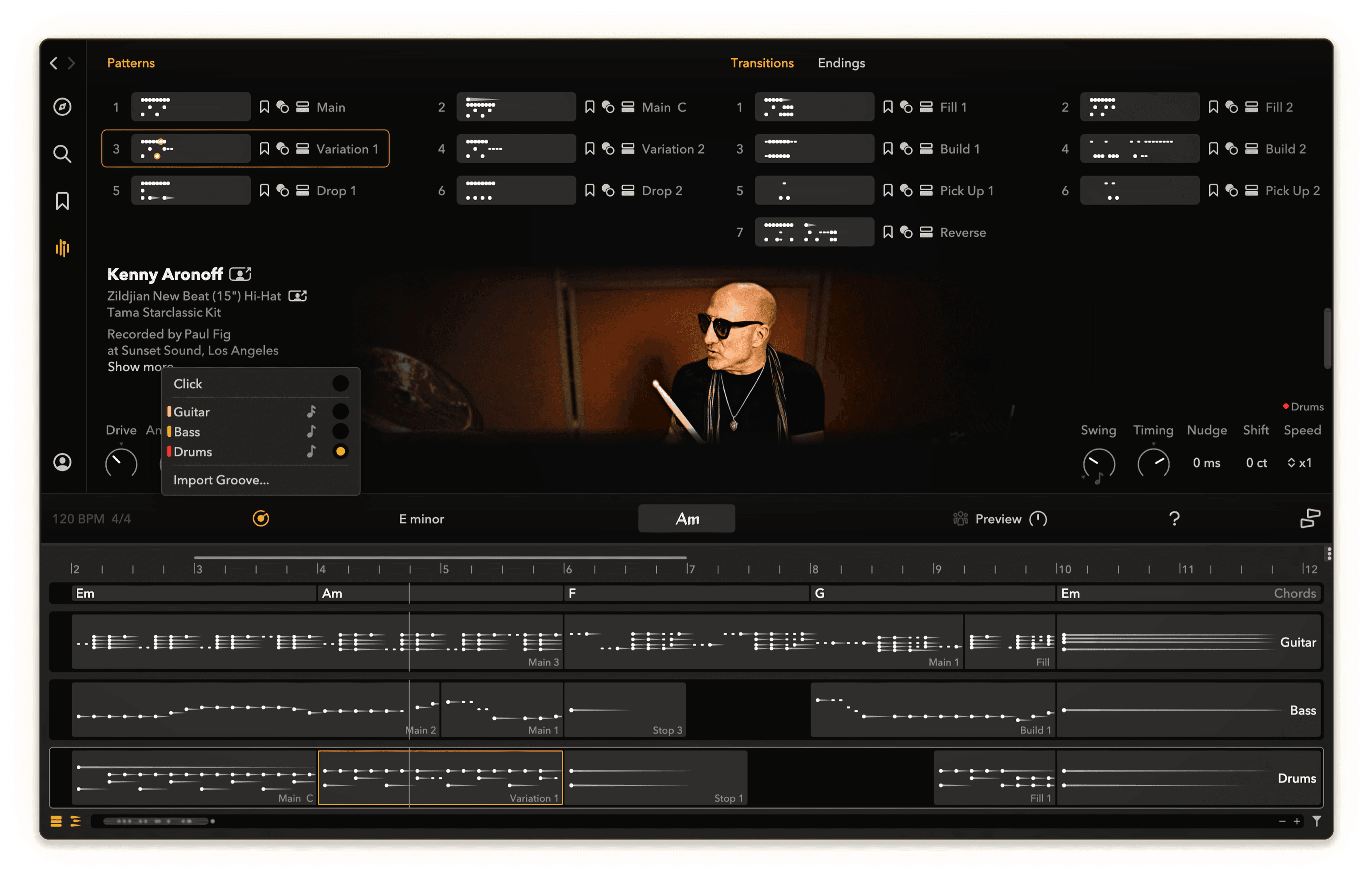 Shape tone with Drive, Effects, and Ambience — all designed to sit naturally in your mix. For drums, adjust kit and cymbals independently, so each element finds its place in the mix without losing the player’s feel.